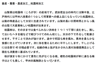 山梨県は枯露柿(ころがき)の産地でもあります。武田信玄公の時代には陣中食、江戸時代には甲州八珍果の1つとして将軍家への献上品にもなっていた枯露柿は、山梨の特産品として大切に生産されています。山梨の長い日照時間とからっ風のお陰で大変甘い枯露柿が出来ます。\n\n枯露柿は、そのままでは食べられない渋柿を1つ1つ丁寧に皮をむき、残しておいたヘタを紐などで結びつけてのれん状にし、天日の下で吊るして乾燥させます。干すことで渋みが抜けます。途中で何回も柿を揉み、果肉を柔らかな食感に仕上げていきます。次に形を整えるために平干しにします。干し上げるには全部で40日程必要です。\n\n秋が深まり冬にかけて景色に色がなくなる頃、橙色の枯露柿が軒に連なる様子はそれは美しく、甲州の風物詩となっています。